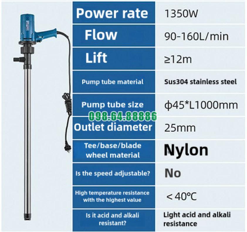 Bơm điện cầm tay hút thùng phuy JDT-1350W-SUS304N sở hữu công suất mạnh mẽ