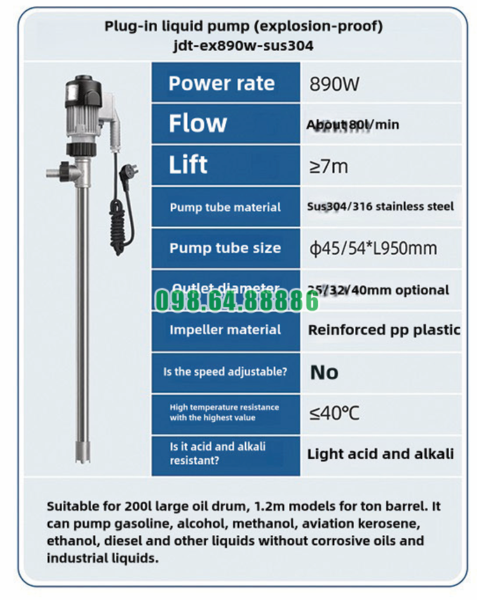 Máy bơm chất lỏng cắm trực tiếp chống cháy nổ JDT-EX890W-SUS304 được thiết kế chuyên dụng để xử lý và vận chuyển các loại dung dịch hóa chất một cách an toàn, hiệu quả và ổn định. Nhờ cấu tạo tối ưu cùng vật liệu cao cấp, thiết bị đáp ứng tốt yêu cầu khắt khe trong môi trường hóa chất.