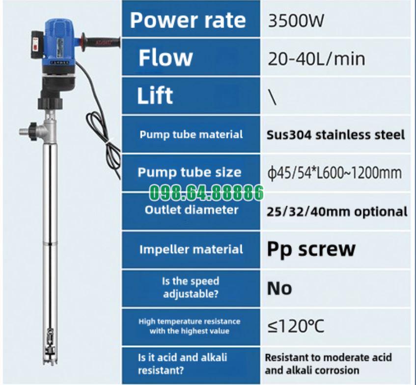 Máy bơm điện cầm tay hút thùng phuy JDT-3500W-LGG120 là một lựa chọn lý tưởng cho các công việc bơm hút chất lỏng trong các ngành công nghiệp. Dưới đây là những lý do bạn nên chọn sản phẩm này: