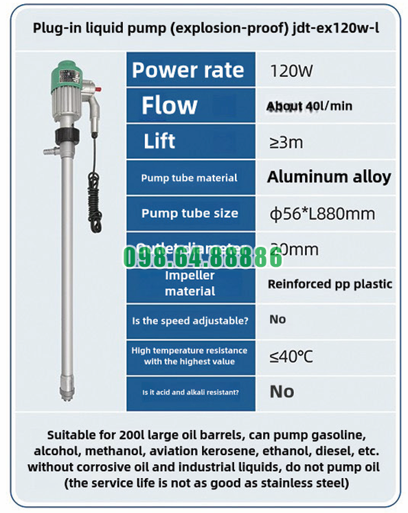 Máy bơm chất lỏng cắm trực tiếp chống cháy nổ JDT-EX120W-L đạt chuẩn chống cháy nổ quốc tế