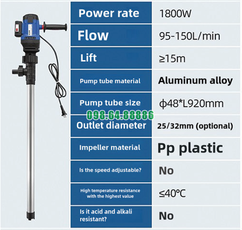 Thông số Bơm điện chất lỏng cắm điện JDT-1800W-L92