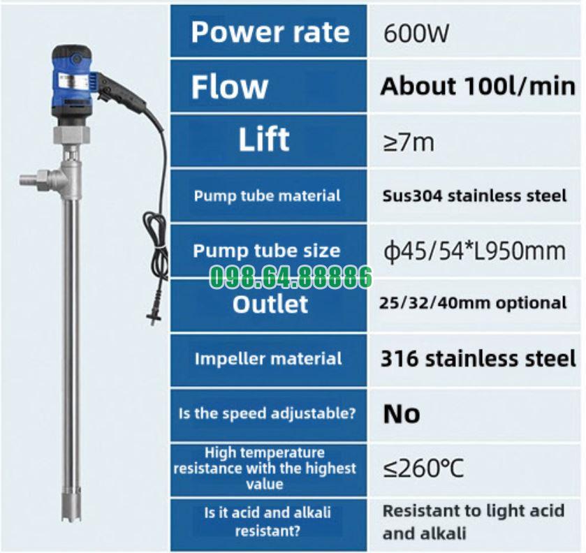 Bơm chìm hút thùng phuy nhiệt độ cao JDT-600W-G260 không chỉ nổi bật với khả năng chịu nhiệt, vận hành êm và độ bền cao, mà còn được đánh giá rất tốt nhờ thiết kế dạng module, giúp việc bảo trì – sửa chữa trở nên dễ dàng, nhanh chóng và tiết kiệm chi phí cho doanh nghiệp.