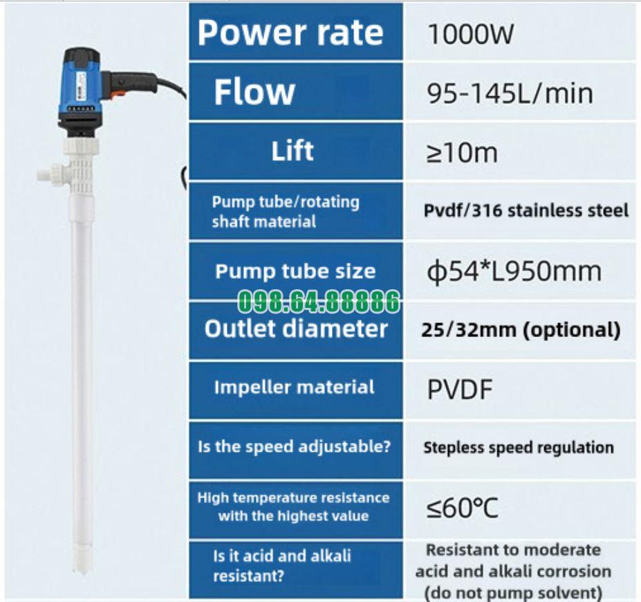 Bơm cắm điện thùng phuy JDT-1000W-PVDF mang lại sự thuận tiện tối đa nhờ thiết kế tối giản, thao tác dễ dàng và vận hành nhanh chóng, phù hợp với hầu hết nhu cầu chuyển chất lỏng trong công nghiệp.