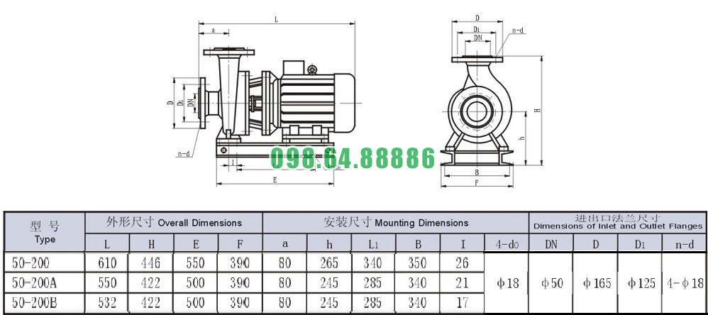 Bản vẽ cấu tạo và kích thước bơm li tâm trục ngang SLW-ISW50-200 có động cơ 5.5 kw đẩy cao 52m