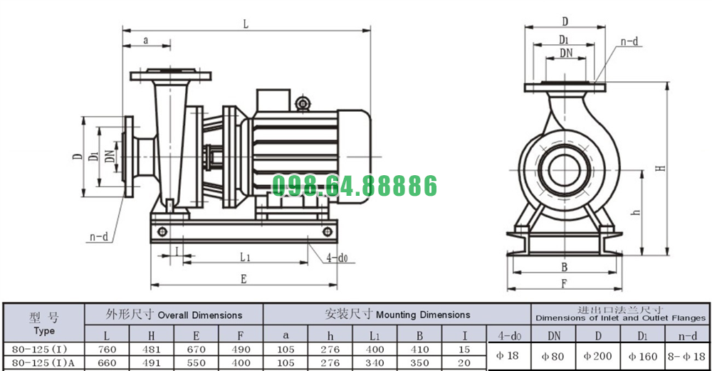 Bảng thông số kỹ thuật bơm li tâm trục ngang SLW80-ISW80-125-I có động cơ 11 kw đẩy cao 23.5m