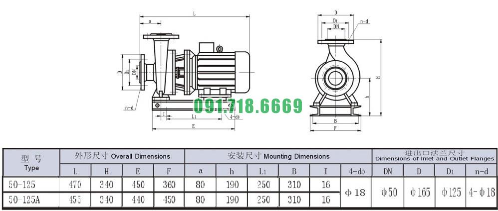 Bản vẽ cấu tạo và kích thước bơm nước trục ngang SLW-ISW50-125 lưu lượng 4.53 L/s