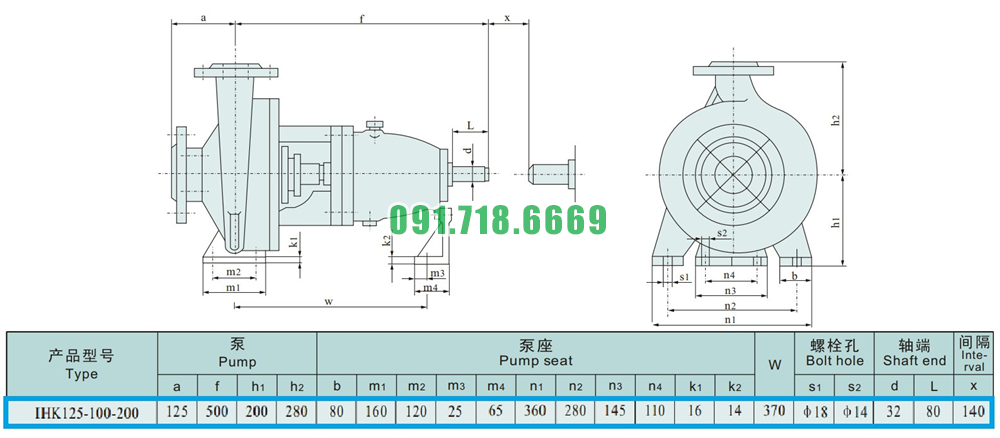 Kích thước của đầu máy bơm nước li tâm cánh hở IHK125-100-200 làm bằng inox