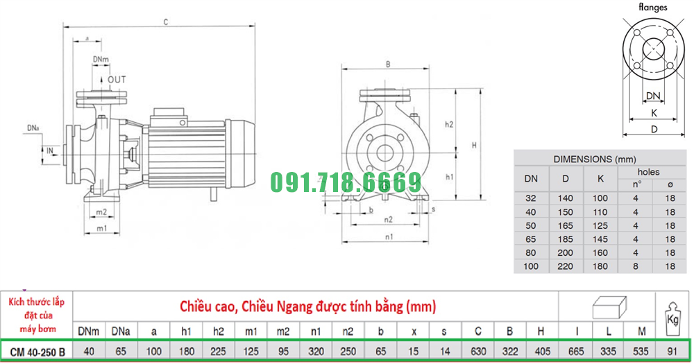 Kích thước máy bơm nước sạch li tâm CM40-250A làm bằng gang