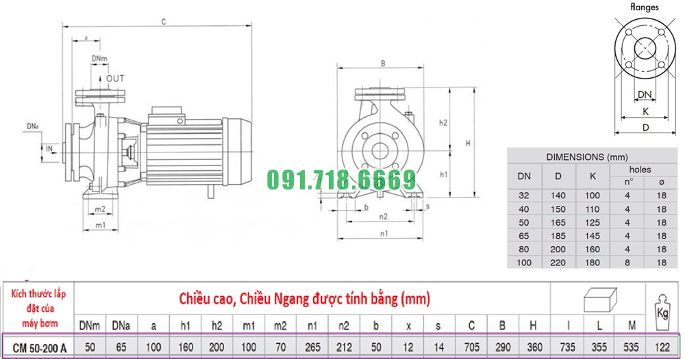 Kích thước máy bơm nước sạch li tâm trục ngang CM50-250C lưu lượng 78 m3/h