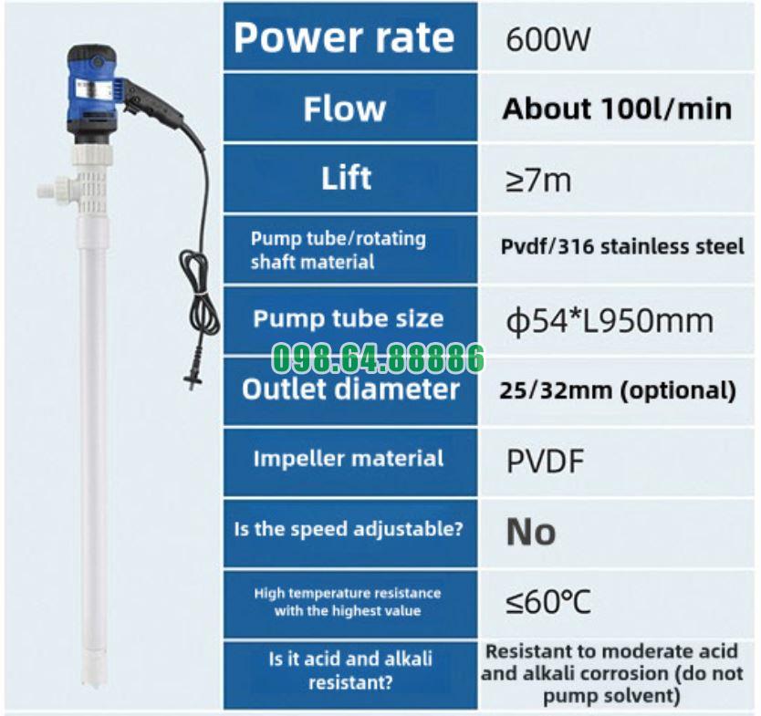Máy bơm thùng phuy cắm điện JDT-600W-PVDF là giải pháp tối ưu cho chất lỏng ăn mòn, nhờ vật liệu PVDF chống hóa chất, thiết kế kín an toàn và hiệu suất ổn định. Sản phẩm đáp ứng tiêu chuẩn của các môi trường làm việc khắc nghiệt nhất, mang lại độ tin cậy, an toàn và hiệu quả lâu dài cho doanh nghiệp.