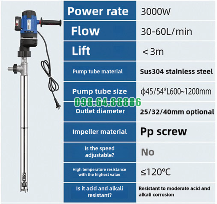 Vật liệu chế tạo cao cấp là yếu tố quan trọng giúp Máy bơm điện chất lỏng JDT-3000W-LGG120 đạt được độ bền và hiệu suất vận hành ổn định. Sự kết hợp giữa ống bơm thép không gỉ SUS304, cánh bơm nhựa PP và hệ thống trục truyền động chắc chắn giúp thiết bị hoạt động hiệu quả với nhiều loại chất lỏng có độ nhớt cao trong môi trường công nghiệp.