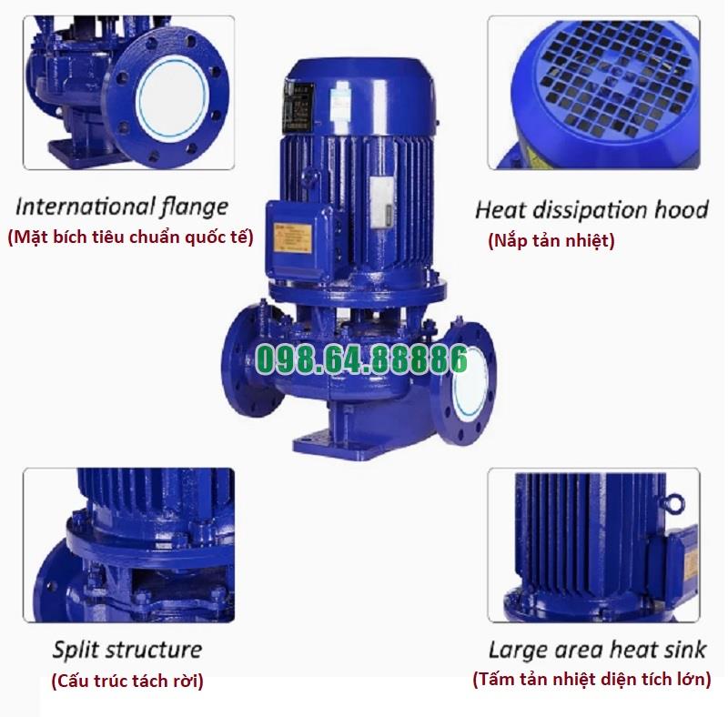Thiết kế gọn gàng, tiết kiệm diện tích: Bơm trục đứng đồng trục, đặt gọn trong phòng kỹ thuật hoặc tầng hầm mà không chiếm nhiều không gian.